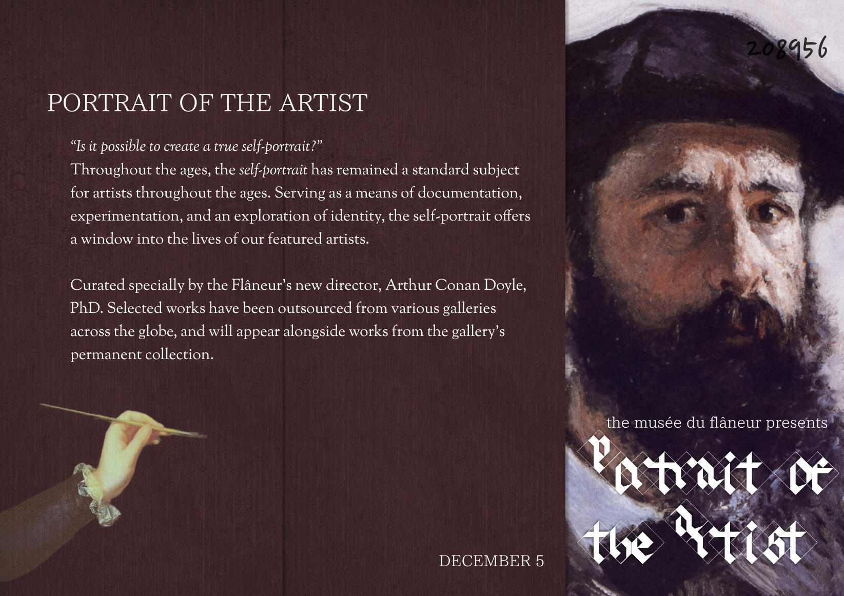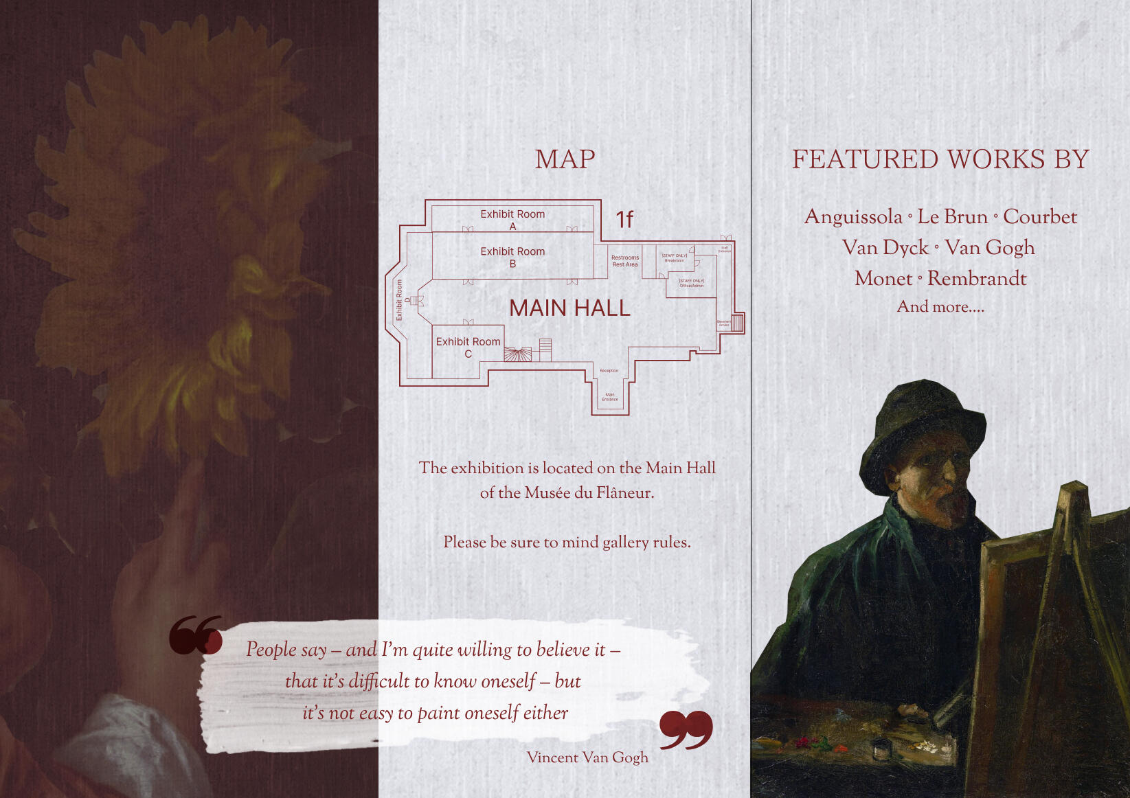 Past the guests who don’t give you a second glance and up the winding staircase, you find yourself in a much quieter part of the museum. Those familiar with the museum (or those who bothered to read the map) will know that this is where the permanent collection of the previous owner is housed.A placard on the wall greets you as you make your way up the stairs: DAEDALUS WING - European Art and Sculptures.You feel the eyes of the paintings on the wall follow you as you walk further into the space. Turning the corner, you note the presence of several rooms, identified by the respective placard: PORTRAITS, STILL LIFE, LANDSCAPE. Only the doors to the PORTRAIT room have been left open – some might even say carelessly.Or maybe you aren’t interested in that at all.… Hm. Alas. It seems that all other doors on this floor (LIBRARY, MEDIEVAL ART, TEXTILES, DRAWINGS, PHOTOGRAPHS) have been closed and locked. Even those to the restrooms.Looks like you’ll have to go back downstairs to relieve yourself.