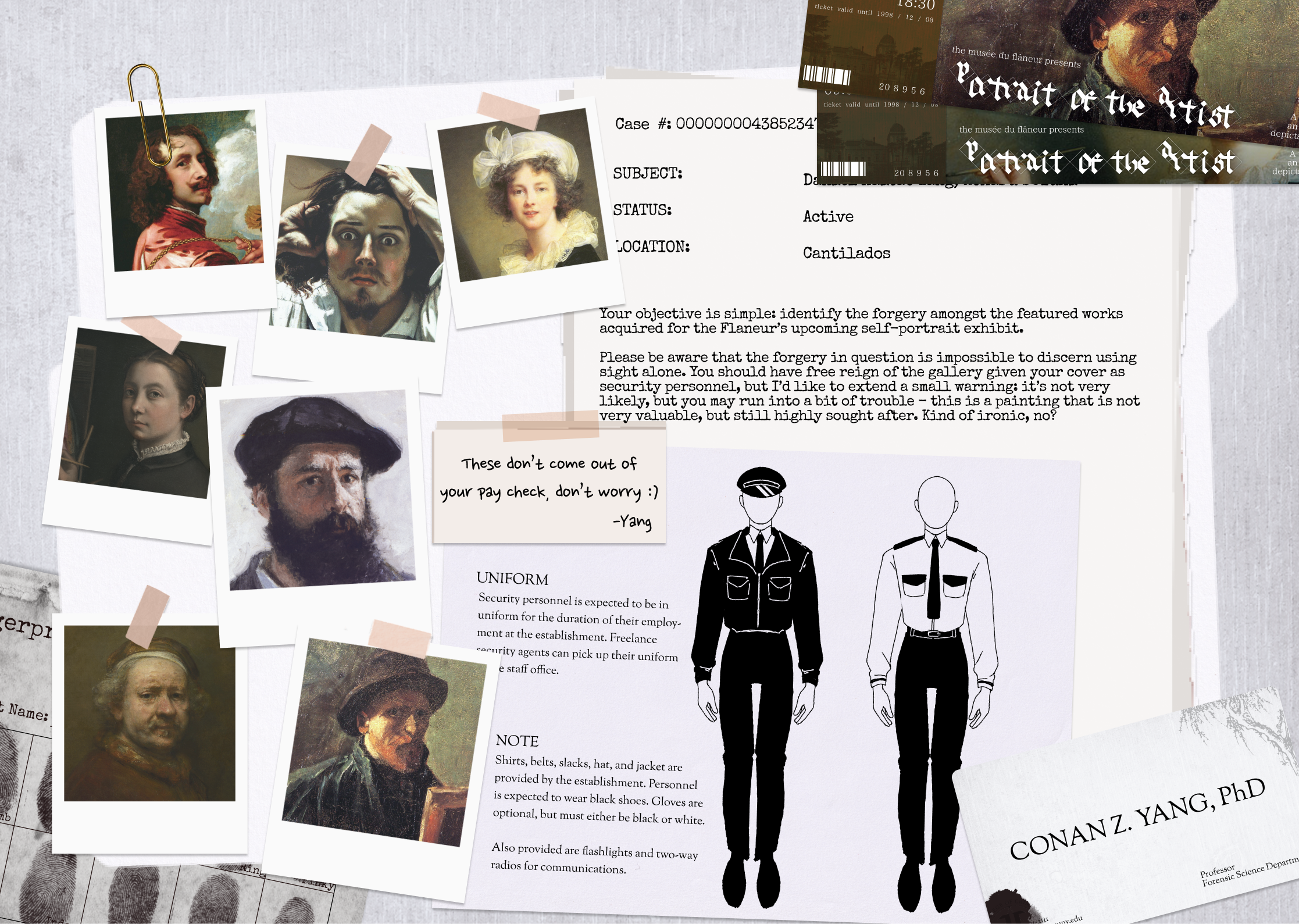 Past the guests who don’t give you a second glance and up the winding staircase, you find yourself in a much quieter part of the museum. Those familiar with the museum (or those who bothered to read the map) will know that this is where the permanent collection of the previous owner is housed.A placard on the wall greets you as you make your way up the stairs: DAEDALUS WING - European Art and Sculptures.You feel the eyes of the paintings on the wall follow you as you walk further into the space. Turning the corner, you note the presence of several rooms, identified by the respective placard: PORTRAITS, STILL LIFE, LANDSCAPE. Only the doors to the PORTRAIT room have been left open – some might even say carelessly.Or maybe you aren’t interested in that at all.After all, it’s hard to ignore the crouching figure who appears to be messing with the doorknob of another room on the furthest end of the hall… the LIBRARY, was it?PING @ JADE to investigate